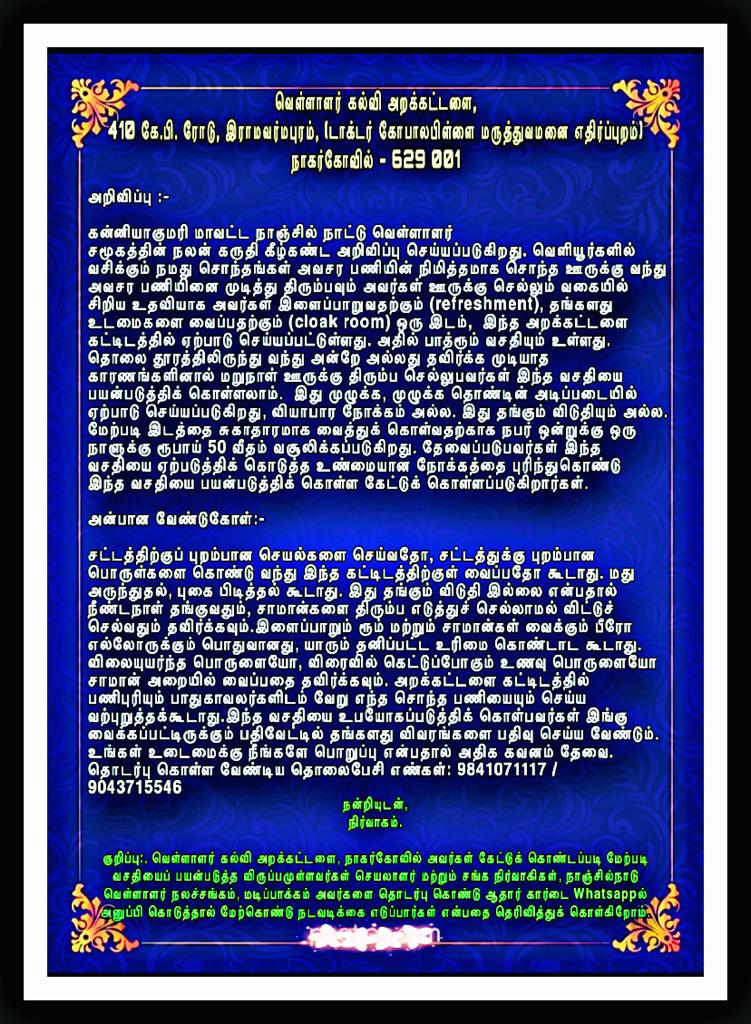 நாஞ்சில் வெள்ளாள சமுதாய வளர்ச்சிக்காக, ஒவ்வொரு ஊரிலும் உள்ள நமது மக்கள் ஒரு குழுவாக இணைந்து, ஒரு ச...